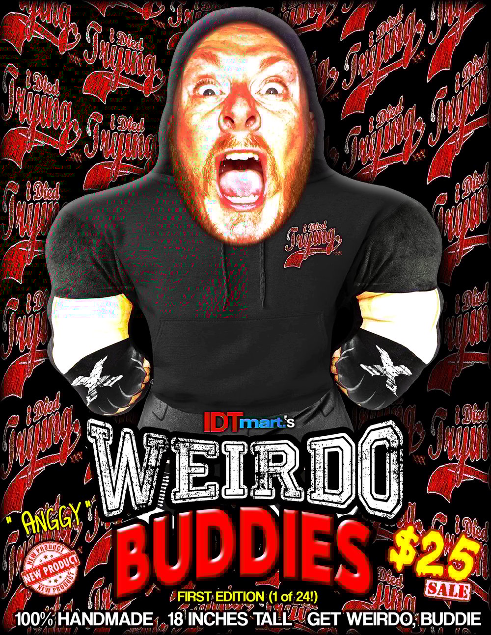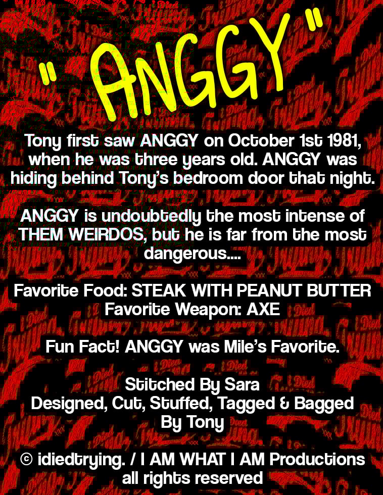 *Weirdo Buddies are pretty tough & can be wrestled with & even shared with your pets as you can see in the photos! BUT! Each one comes with a used guitar pick by Tony inside somewhere so please be mindful of that when letting your pets get weirdo. Probably not meant for dogs who can tear up stuffies, etc*